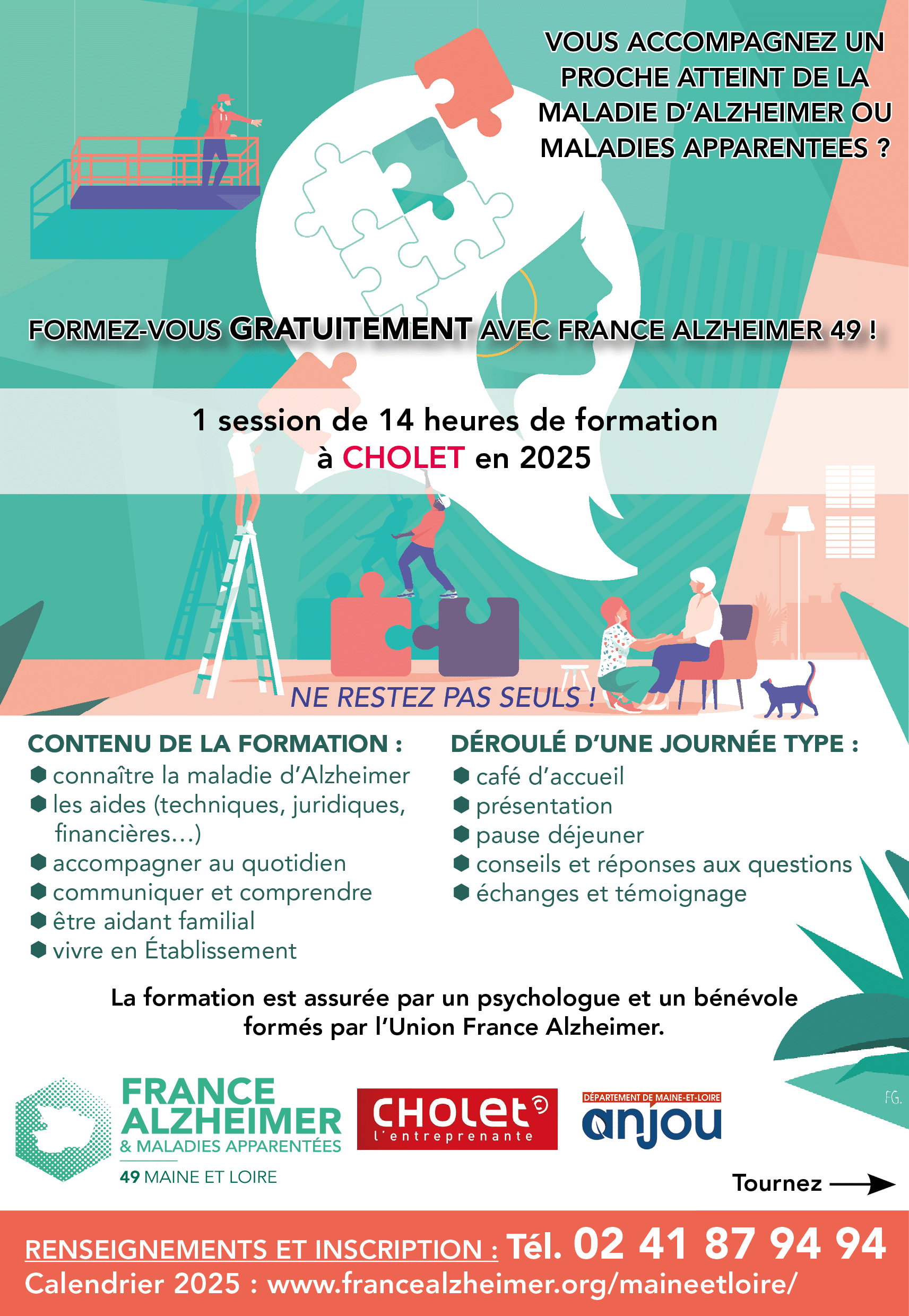 L’association France Alzheimer 49, organise une formation gratuite destinée aux aidants de personnes atteintes de la maladie d’Alzheimer ou d’une maladie apparentée.